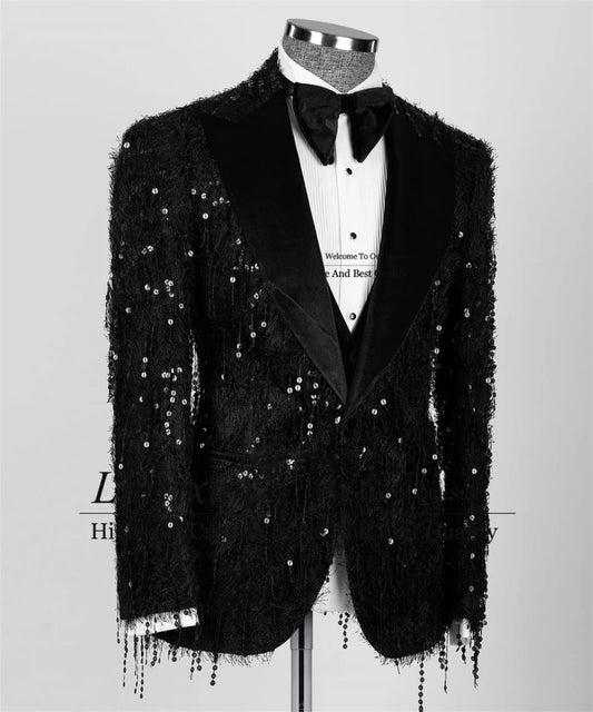 Glitter Sequin Groom Wedding Tuxedo Peaked Lapel Men Suit
