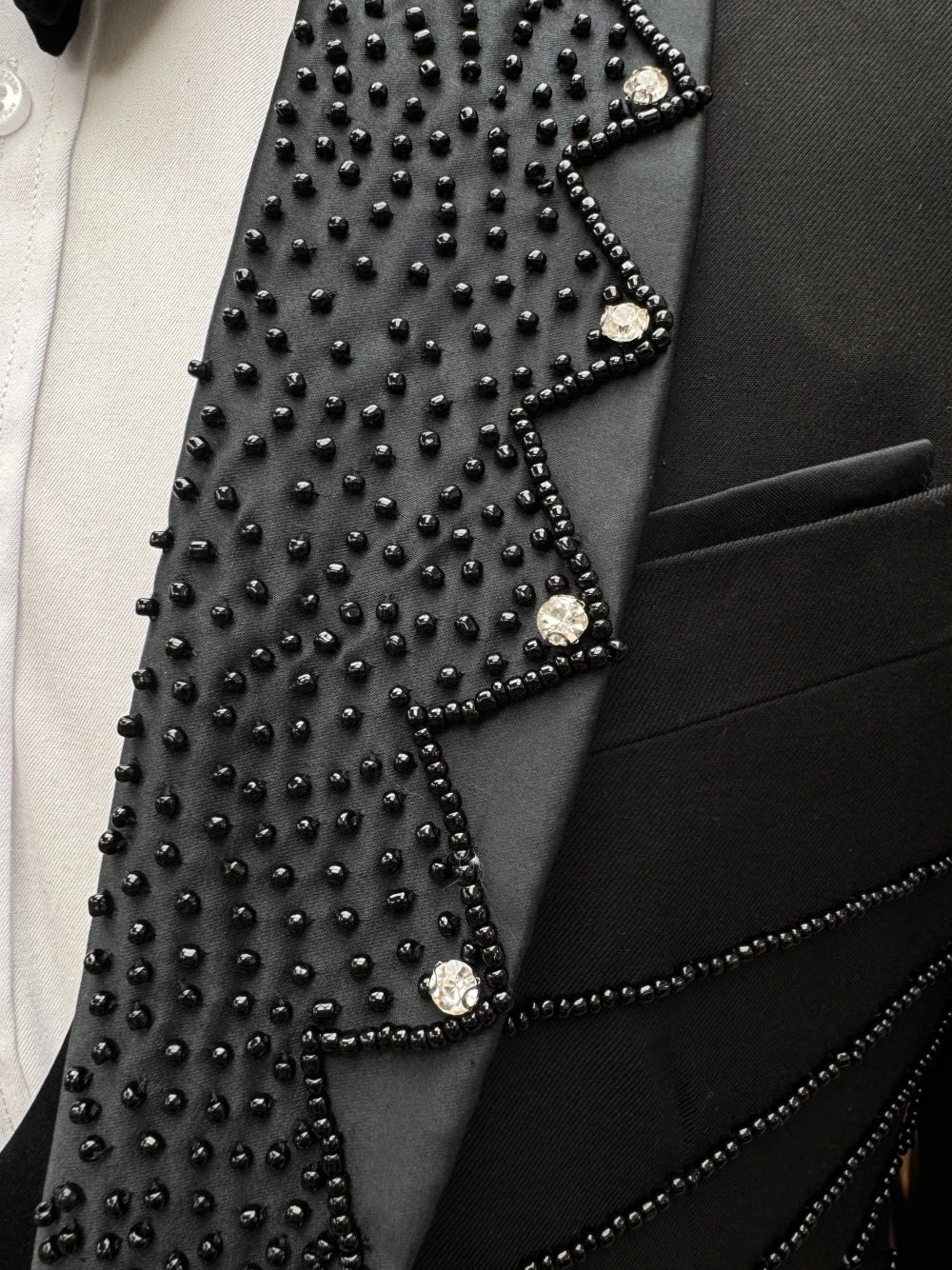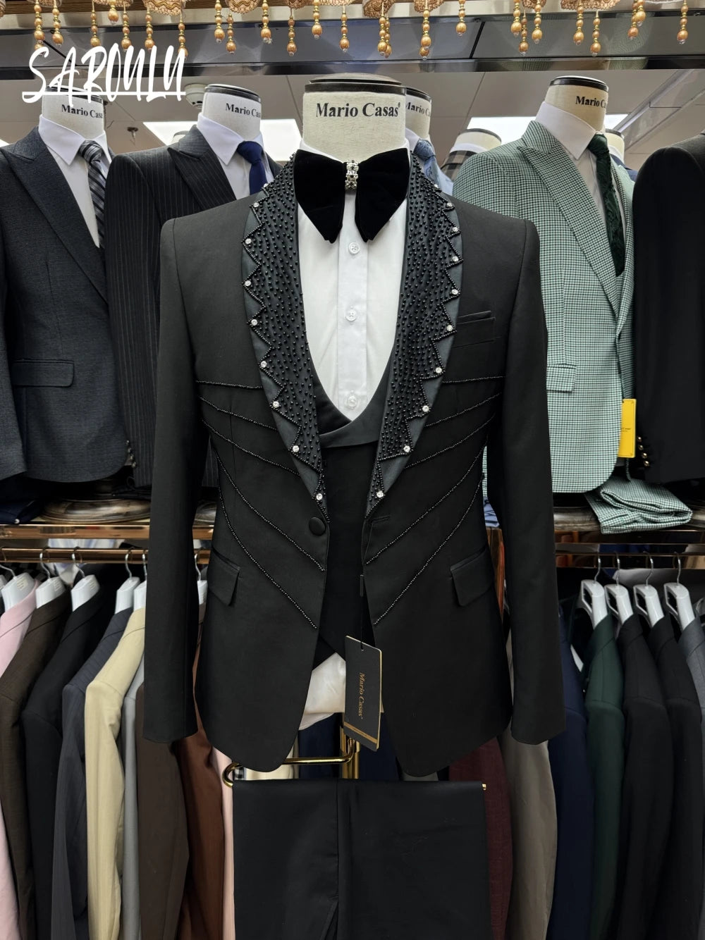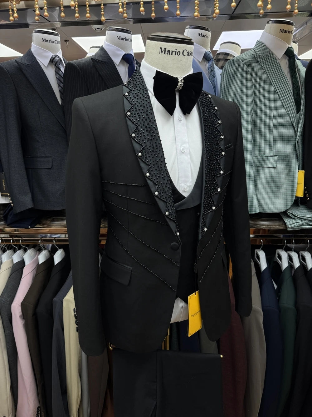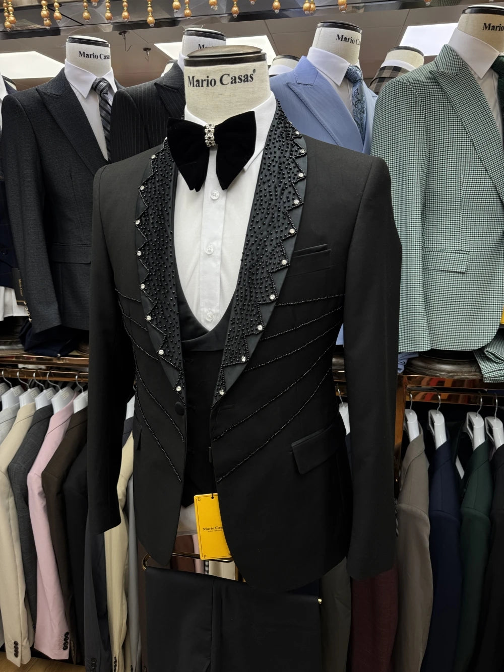 Charming Black Beaded Luxurious Men's Suit Customized Celebrity Popular Groom Wear Decent Jacket Vest Pants Date Set Hot Sale